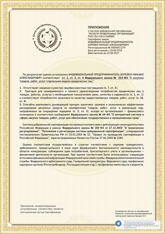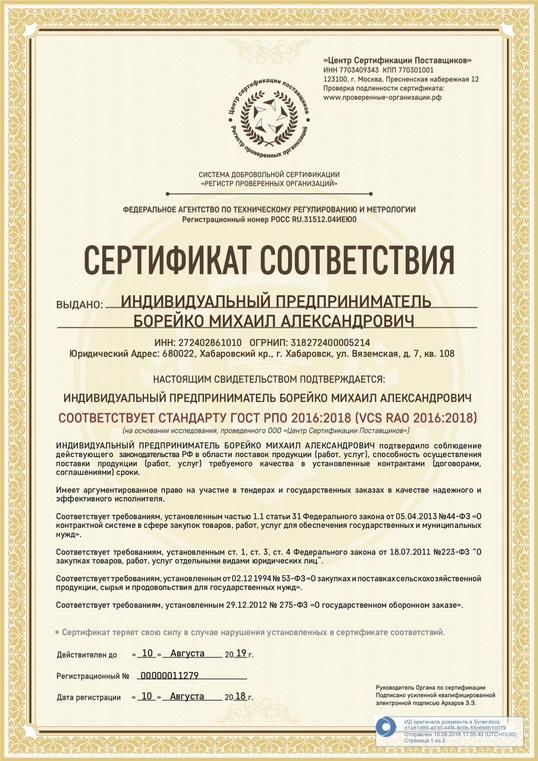 Сертификат соответствия стандарту ГОСТ РПО 2016:2018 (VCS RAO 2016:2018)